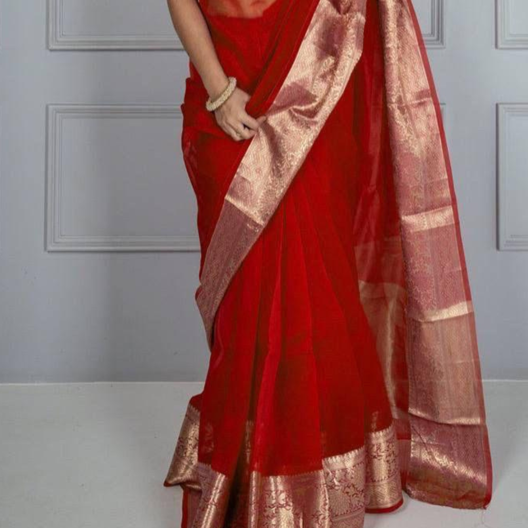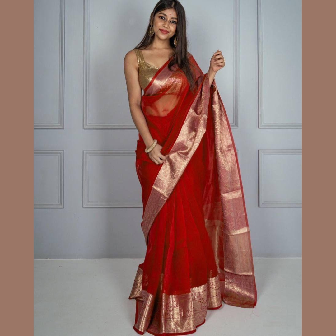 Red Kora Organza jacquard Soft Saree With Pallu & Running Blouse